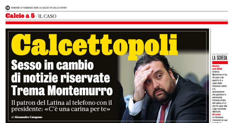 L’edizione odierna della “Gazzetta dello Sport” si sofferma sullo scandalo “Calcettopoli”. Ieri mattina, Andrea Montemurro si è presentato regolarmente al secondo piano del palazzo di piazzale Flaminio, dove ha sede la Divisione Calcio a 5. Nemmeno il tempo di sedersi e i due minuti della telefonata di luglio con l’ex sodale La Stara, erano online. Lui, il presidente della Divisione, che regala un’informazione riservata. L’altro il patron della Lynx Latina, che per sdebitarsi dice: «Fai l’estate e poi ti faccio quel regalo: carina, carina, quando la vedi mi dirai. Pure intelligente: così te passi qualche weekend sereno pure da ste’ parti». E lui, Montemurro: «E dai, come no, benissimo». Già ribattezzata “sex gate”, la Calcettopoli in salsa romano-pontina. Dopo un confronto con Sibilia, presidente dei dilettanti, Montemurro ha evitato di dimettersi. Resterà formalmente in carica. Gravina gli ha chiesto di auto-sospendersi dalla carica di consigliere federale.