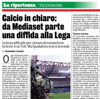L’edizione odierna della “Gazzetta dello Sport” si sofferma sulla diffida di Mediaset alla Lega. Altre tv sono pronte a fare lo stesso, e a inserirsi nella trattativa avviata tra il ministro dello Sport Spadafora e Sky: nei contatti di due giorni fa era emersa la possibilità di trasmettere due-tre partite delle prime due giornate su Tv8, canale in chiaro di Sky. Le ipotesi sono due: viene indetto un bando d’asta per i diritti in chiaro, ma i tempi non lo consentirebbero, oppure il governo modifica l’attuale Legge Melandri.