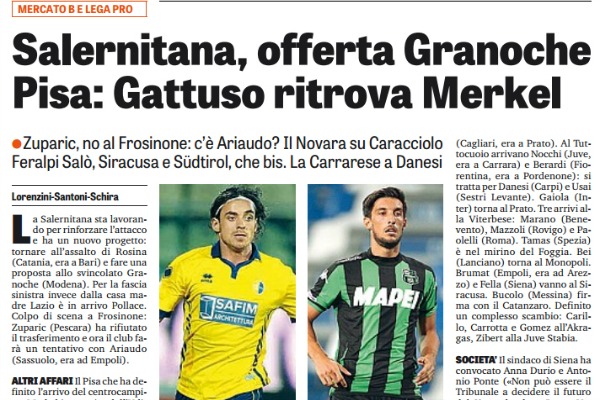 “La Salernitana sta lavorando per rinforzare l’attacco e ha un nuovo progetto: tornare all’assalto di Rosina (Catania, era a Bari) e fare una proposta allo svincolato Granoche (Modena). Per la fascia sinistra invece dalla casa madre Lazio è in arrivo Pollace. Colpo di scena a Frosinone: Zuparic (Pescara) ha rifiutato il trasferimento e ora il club farà un tentativo con Ariaudo (Sassuolo, era ad Empoli). ALTRI AFFARI Il Pisa che ha definito l’arrivo del centrocampista Merkel in prestito dall’Udinese: ha giocato con Gattuso nel Milan. Boscaglia ha chiesto Antonio Caracciolo per la difesa del Novara, ma il Brescia al momento ha detto di no. Tentativo dello Spezia per l’attaccante Stoian (Crotone), per la porta spunta il nome di Pigliacelli (Pescara, era a Vercelli); in difesa si stringe per Masi: alla Ternana può andare Acampora. Tutto risolto per il Vicenza: sono arrivati Rizzo (Perugia) e Pucino (Chievo, era ad Avellino). Alla Spal, in attesa di Dellafiore, si aggrega un altro ex difensore del Latina: Figliomeni. L’ultima idea dell’Ascoli in attacco è Rosseti (Juventus, era a Cesena). Il Benevento tratta il terzino sinistro Dell’Orco (Sassuolo, era a Novara) e il centrocampista Bruno (Pescara). De Cenco (Pavia) può tornare al Trapani. Il giovane difensore Marchizza (Roma) piace alla Pro Vercelli. Il Perugia ha chiesto Fontanesi (ex Cesena) al Sassuolo e Mignanelli (ex Reggiana) al Pescara. Ufficiali due difensori: Gonzalez (Verona, era alla Ternana) all’Avellino e Bonifazi (Torino, era a Caserta) alla Spal. LEGA PRO Doppietta della Feralpi Salò che prende Aquilanti (Lanciano) e Bizzotto (Cittadella). Idem per il Südtirol con Martinelli (Sangiovannese) e Rosafio (Lecce). Il Mantova cerca di riprendere Siniscalchi (Pavia, piace anche all’Ancona) e Paro (Crotone, potrebbe scegliere di entrare nello staff di Juric al Genoa). Cappelletti (Cittadella) verso Padova. La Pro Piacenza ingaggia l’esperto Pesenti (AlbinoLeffe). La Reggiana entra nella lista dei pretendenti per Cesarini (Pavia). Appiah (Inter) piace al Modena. Definito il passaggio di Grossi (Ternana) all’Arezzo. La Pistoiese chiude per Varano (Cesena) e punta su Capello (Cagliari, era a Prato). Al Tuttocuoio arrivano Nocchi (Juve, era a Carrara) e Berardi (Fiorentina, era a Pordenone): si tratta per Danesi (Carpi) e Usai (Sestri Levante). Gaiola (Inter) torna al Prato. Tre arrivi alla Viterbese: Marano (Benevento), Mazzoli (Rovigo) e Paolelli (Roma). Tamas (Spezia) è nel mirino del Foggia. Bei (Lanciano) torna al Monopoli. Brumat (Empoli, era ad Arezzo) e Fella (Siena) vanno al Siracusa. Bucolo (Messina) firma con il Catanzaro. Definito un complesso scambio: Carillo, Carrotta e Gomez all’Akragas, Zibert alla Juve Stabia. SOCIETA’ Il sindaco di Siena ha convocato Anna Durio e Antonio Ponte («Non può essere il Tribunale a decidere il futuro del Siena» ha detto Bruno Valentini) in un incontro a oltranza fino a quando non si trova una soluzione: stavolta l’attuale proprietario accetterà o non si presenterà come in un’occasione precedente? Presentato invece il nuovo organigramma della Carrarese dopo il fallimento: il nuovo presidente è Salvo Zangari (ex Monza, Lecco e Pro Sesto, ha il 40%), nel consiglio alcuni imprenditori del marmo (a loro il resto delle quote: potrebbe partecipare anche Buffon), il direttore generale è l’ex difensore Fabrizio Anzalone, mentre come allenatore arriva l’esordiente Andrea Danesi (ex Massese)”. Questo quanto si legge sull’edizione odierna de “La Gazzetta dello Sport”.