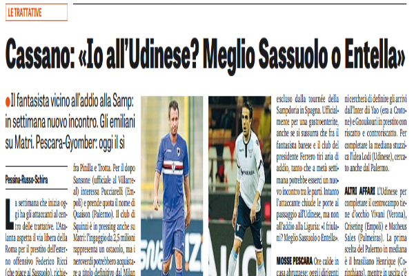 “La settimana che inizia oggi ha gli attaccanti al centro delle trattative. L’Atalanta aspetta il via libera della Roma per il prestito dell’esterno offensivo Federico Ricci (che piace al Sassuolo), richiesto da Gasperini per completare il 343. Molto attivo il Sassuolo, che tratta il Papu Gomez con l’Atalanta, ritenuto però incedibile, e valuta lo scambio fra Pinilla e Trotta. Per il dopo Sansone (ufficiale al Villarreal) interessa Pucciarelli (Empoli) e prende quota il nome di Quaison (Palermo). Il club di Squinzi è in pressing anche su Matri: l’ingaggio da 2,5 milioni rappresenta un ostacolo, ma i neroverdi potrebbero acquistare a titolo definitivo dal Milan il centravanti, che spalmerebbe lo stipendio su due anni. CASO CASSANO Torna a parlare Antonio Cassano, rimasto escluso dalla tournée della Sampdoria in Spagna. Ufficialmente per una gastroenterite, anche se si sussurra che fra il fantasista barese e il club del presidente Ferrero tiri aria di addio, tanto che a metà settimana potrebbe esserci un nuovo incontro tra le parti. Intanto l’attaccante chiude le porte al passaggio all’Udinese, ma non all’addio alla Liguria: «I friulani? Meglio Sassuolo o Entella». MOSSE PESCARA Ore calde in casa abruzzese: oggi i dirigenti biancazzurri vedranno la Roma per chiudere il prestito del centrale Gyomber, sul quale ha provato a inserirsi l’Atalanta. Domani il presidente Sebastiani cercherà di definire gli arrivi dall’Inter dii Yao (era a Crotone) e Gnoukouri in prestito con riscatto e controriscatto. Per completare la mediana stuzzica l’idea Lodi (Udinese), cercato anche dal Palermo. ALTRI AFFARI L’Udinese per completare il centrocampo tiene d’occhio Vivani (Verona), Criseting (Empoli) e Matheus Sales (Palmeiras). La prima scelta del Palermo in mediana è il brasiliano Henrique (Corinthians), mentre in uscita c’è l’esterno Lazaar che piace a Marsiglia e West Ham. Il terzino Veseli (era al Lugano) firma un biennale con l’Empoli”. Questo quanto si legge sull’edizione odierna de “La Gazzetta dello Sport”.