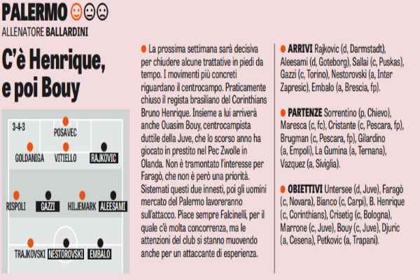 “La prossima settimana sarà decisiva per chiudere alcune trattative in piedi da tempo. I movimenti più concreti riguardano il centrocampo. Praticamente chiuso il regista brasiliano del Corinthians Bruno Henrique. Insieme a lui arriverà anche Ouasim Bouy, centrocampista duttile della Juve, che lo scorso anno ha giocato in prestito nel Pec Zwolle in Olanda. Non è tramontato l’interesse per Faragò, che non è però una priorità. Sistemati questi due innesti, poi gli uomini mercato del Palermo lavoreranno sull’attacco. Piace sempre Falcinelli, per il quale c’è molta concorrenza, ma le attenzioni del club si stanno muovendo anche per un attaccante di esperienza.