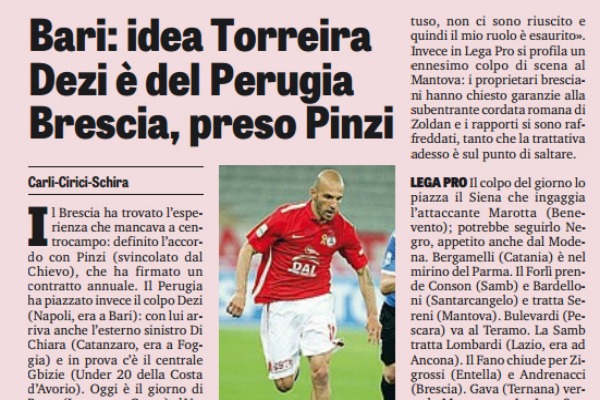 “Il Brescia ha trovato l’esperienza che mancava a centrocampo: definito l’accordo con Pinzi (svincolato dal Chievo), che ha firmato un contratto annuale. Il Perugia ha piazzato invece il colpo Dezi (Napoli, era a Bari): con lui arriva anche l’esterno sinistro Di Chiara (Catanzaro, era a Foggia) e in prova c’è il centrale Gbizie (Under 20 della Costa d’Avorio). Oggi è il giorno di Bessa (Inter, era a Como) al Verona, che nel frattempo ha ufficializzato il triennale al difensore Antonio Caracciolo (Brescia). Il Vicenza si avvicina a Besea (Modena).Un’altra idea per il centrocampo del Bari: l’uruguaiano Torreira della Samp (era a Pescara), mentre per Basha si attende il via libera del Lucerna. Il Benevento ha trovato l’accordo con Ardemagni: l’incontro con l’Atalanta non è ancora stato fissato, ma non sembrano esserci intoppi. La Ternana tratta Torregrossa (Verona, era a Trapani), Chouchoumis (Panathinaikos), Moretti (Latina, era a Vicenza) e Acampora (Spezia). IL CASO ROSINA E’ uno dei grandi casi dell’estate, ma ancora non ha soluzione. Ieri s’è sparsa la voce che Alessandro Rosina (ex Bari) avesse trovato l’accordo con il Catania per risolvere il contratto (scadenza 2017), potendo così sottoscrivere il triennale con la Salernitana. Ma non è così: le parti sono ancora lontane,è muro contro muro. La stessa Salernitana invece ha preso il portiere greco Iliadis (ex Iraklis e Olympiacos), ha chiesto Improta (era al Cesena) al Genoa e il difensore goleador De Santis (8 gol in Primavera) al Milan. SOCIETA’ Giornata decisiva a Pisa: Pablo Dana è a Forte dei Marmi con i soci in attesa di una risposta di Britaly Post (ha il 100% delle quote) sul preliminare per avviare l’acquisto del club, con conseguente ritorno di Gattuso; intanto dopo una settimana Maurizio Mian ha lasciato la presidenza onoraria: «Volevo far tornare Gattuso, non ci sono riuscito e quindi il mio ruolo è esaurito». Invece in Lega Pro si profila un ennesimo colpo di scena al Mantova: i proprietari bresciani hanno chiesto garanzie alla subentrante cordata romana di Zoldan e i rapporti si sono raffreddati, tanto che la trattativa adesso è sul punto di saltare. LEGA PRO Il colpo del giorno lo piazza il Siena che ingaggia l’attaccante Marotta (Benevento); potrebbe seguirlo Negro, appetito anche dal Modena. Bergamelli (Catania) è nel mirino del Parma. Il Forlì prende Conson (Samb) e Bardelloni (Santarcangelo) e tratta Sereni (Mantova). Bulevardi (Pescara) va al Teramo. La Samb tratta Lombardi (Lazio, era ad Ancona). Il Fano chiude per Zigrossi (Entella) e Andrenacci (Brescia). Gava (Ternana) verso la Maceratese. La Juve Stabia si avvicina a Cisse (Benevento). Stendardo (Fidelis Andria), Altobello (Teramo) e Potenza (Maceratese) rinforzano il Taranto. Al Monopoli è in arrivo il giovane attaccante sloveno Til Mavretic (Nogometni Ljubljana) e può tornare Bacchetti (Pro Vercelli). Poker Melfi: presi Esposito (Pro Vercelli), Ferraro (Napoli), Gragnaniello (Casertana) e Paterni (Fidelis Andria). Leonetti (Rimini) è passato alla Vibonese. Attivissima la Reggina che preleva Lo e Bianchimano dal Milan e tratta Tripicchio (Crotone), Momentè, Tripoli e Di Santantonio (Mantova). ESONERO Colpo di scena a Catanzaro: è saltata la panchina di Erra per divergenze di mercato con il d.s. Preiti. Piace Grassadonia, se lascia Pagani, ma la società farà anche un tentativo con Hernan Crespo”. Questo quanto si legge sull’edizione odierna de “La Gazzetta dello Sport”.
