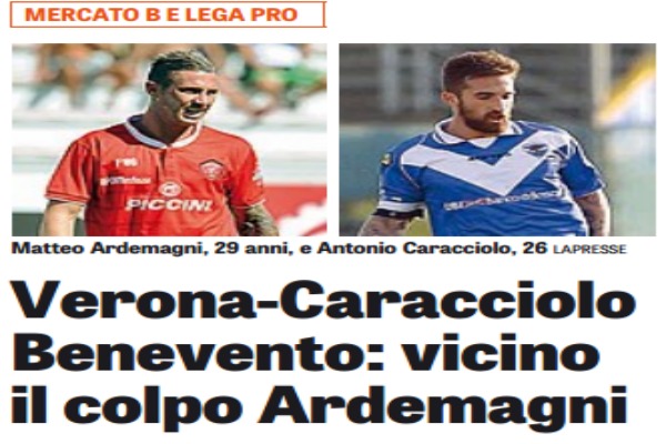 “Nelle ultime sessioni di mercato il protagonista è sempre stato lui: Matteo Ardemagni. Rientrato all’Atalanta dopo la buona stagione a Perugia, è stato richiesto da diverse squadre e a breve conoscerà il suo destino. Il Benevento gli ha proposto un ricco triennale ed è pronto a convincere l’Atalanta. Nei prossimi giorni si firma e quindi cadono gli altri obiettivi giallorossi Maniero e Marilungo. Il Verona, invece, ha chiuso col Brescia per il difensore Antonio Caracciolo, che firmerà un triennale, e aspetta dall’Inter Bessa (ex Como).