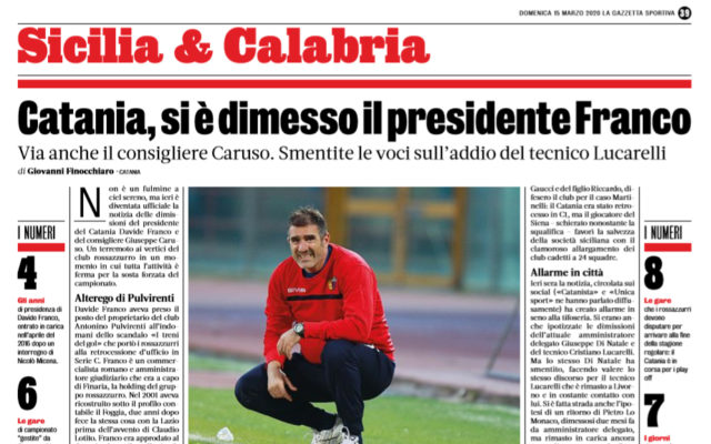 Durante la sosta per l’emergenza Coronavirus, il Catania sta subendo una vera e propria rivoluzione. Infatti si è dimesso il presidente Davide Franco e il consigliere Giuseppe Caruso. L’edizione odierna di “La Gazzetta dello Sport” fa il punto della situazione, ed analizza anche il caso legato al tecnico, Cristiano Lucarelli. Ieri è diventata ufficiale la notizia delle dimissioni del presidente del Catania Davide Franco e del consigliere Giuseppe Caruso. Un terremoto ai vertici del club rossazzurro in un momento in cui tutta l ’attività è ferma per la sosta forzata del campionato. Davide Franco aveva preso il posto del proprietario del club Antonino Pulvirenti all’indomani dello scandalo «I treni del gol» che portò i rossazzurri alla retrocessione d ’ufficio in Serie C. Franco è un commercialista romano e amministratore giudiziario che era a capo di Finaria, la holding del gruppo rossazzurro. Franco era approdato al Catania dopo il crollo in C, chiamato a sostituire Pulvirenti, che doveva scontare una squalifica di cinque anni. Adesso le dimissioni senza una motivazioni ufficiale.Ieri, infatti, i vertici dirigenziali rossazzurri non hanno spiegato il perché della rinuncia di Franco e del consigliere Caruso.I due, però, risultano indagati dopo il sequestro dei documenti (e solo quelli) operato il 12 febbraio scorso dalla Guardia di Finanza che operò un blitz per acquisire prove cartacee che riguardavano lesocietà della galassia che ruota attorno allo stesso Pulvirenti e che toccano, anche, il Calcio Catania.
