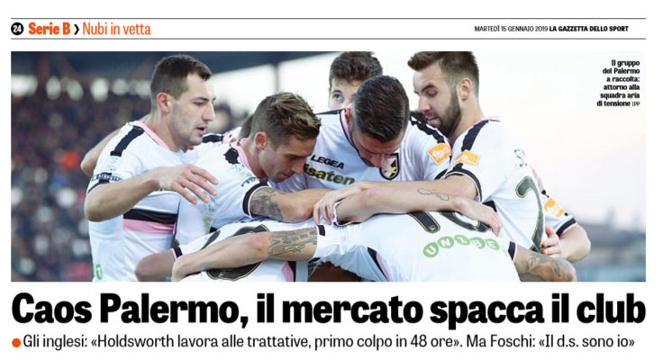 “Scoppia uno strano caso al Palermo, dove è in atto un contenzioso sui ruoli tra la nuova proprietà inglese e la dirigenza lasciata da Zamparini, in particolare sulla posizione del direttore sportivo Rino Foschi, riconfermato all’insediamento dei nuovi proprietari, ma la cui posizione sembra delegittimata di giorno in giorno. Una frattura nata la scorsa settimana, quando i rappresentanti della nuova società hanno trascorso tre giorni a Palermo per iniziare l’insediamento. […] I rappresentanti della Capital Sport Investments, la società diventata proprietaria del Palermo lo scorso 30 dicembre, finora, sono andati avanti a forza di proclami attraverso i rispettivi profili social, evitando un contradditorio in merito a una situazione ancora poco decifrabile, visto che non è stato ancora annunciato un programma, né tanto meno l’aumento di capitale di 20 milioni di euro della stessa società, come da comunicato ufficiale. L’incidente diplomatico si palesa quando Holdsworth, nei giorni scorsi, si è autoproclamato direttore sportivo del Palermo sul proprio profilo LinkedIn e un altro consulente tecnico degli inglesi, Jake Lee, ha chiesto informazioni sul centrocampista del Frosinone, Paganini. Una notizia che ha prodotto un comunicato dell’a.d. Facile in cui è stato riconfermato il ruolo di d.s di Foschi, il quale però sulla vicenda proprio sulla Gazzetta non è stato tenero.«Il mercato lo faccio io, chi si è mosso per il Palermo lo ha fatto non avendo titolo e in modo dilettantistico»,ha detto. Parole alle quali è seguito nella giornata di ieri un post su Instagram di Richardson: «Speriamo di annunciare il primo acquisto nelle prossime 48 ore dopo gli enormi sforzi di Holdsworth e Lee». Nessun riferimento a Foschi in un post scritto in inglese, così come nel comunicato di qualche ora dopo della Sport Capital Group che,però, non è stato pubblicato sul sito del Palermo, in cui Richardson rafforza il ruolo di Holdsworth. «La Sport Capital Group è lieta di annunciare il signor Dean Holdsworth come nostro Director of Football Operations — si legge — Lavorerà con l’attuale squadra dell’U.S. Città di Palermo durante questa finestra di trasferimento e si concentrerà nell’assicurarsi che il personale giusto venga reclutato per guidarci verso una promozione in SerieA. Sarà assistito da Jake Lee e altri di Global Futures Sport e speriamo di poter annunciare il nostro primo acquisto nelle prossime 48 ore». Se non è un isolamento di Foschi, poco ci manca, per quella che ormai appare come una lotta di quartiere all’interno del Palermo. Il dirigente cesenate non l’ha presa bene.«Non so cosa dire. Sono a Milano e ne ho lette di tutti i colori —dice Dovreste chiedere all’amministratore delegato, l’unico a cui rispondo del mio operato». La parola dovrebbe passare a Facile, che resta in silenzio, ma risulta come collante tra la posizione inglese e quella di Foschi. Tutte dinamiche molto discutibili che rischiano di generare un caos con riflessi pericolosi sulla squadra prima in classifica, rievocando un déjàvù della scorsa stagione quando Zamparini con decisioni incomprensibili, iniziate con l’allontanamento del d.s.Lupo a gennaio, minò la solidità di un gruppo che si era laureato campione d’inverno”.