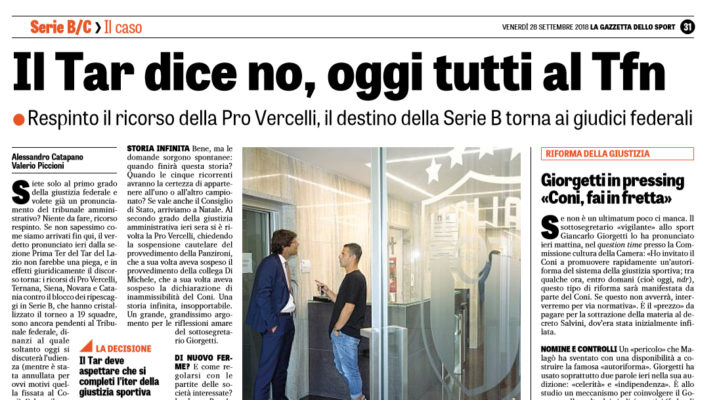 Gazzetta dello Sport: “Caos ripescaggi. Il Tar dice no, oggi tutti al Tfn”