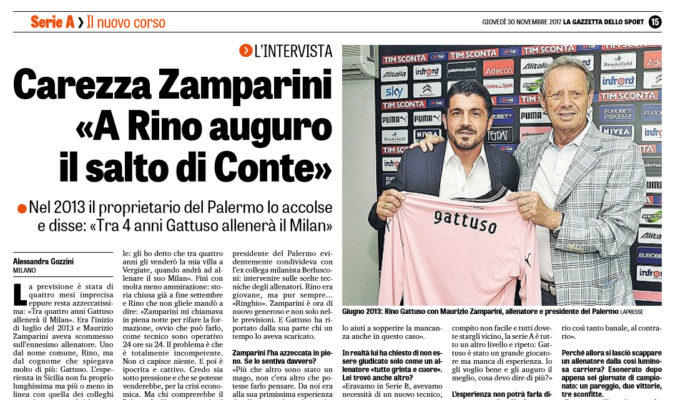 La previsione è stata di quattro mesi imprecisa eppure resta azzeccatissima: «Tra quattro anni Gattuso allenerà il Milan». Era l’inizio di luglio del 2013 e Maurizio Zamparini aveva scommesso sull’ennesimo allenatore. Uno dal nome comune, Rino, ma dal cognome che spiegava molto di più: Gattuso. L’esperienza in Sicilia non fu proprio lunghissima ma più o meno in linea con quella dei colleghi precedenti: e non finì benissimo, anzi. Rino più tardi fu duro con l’ex presidenteche lo aveva licenziato dopo appena sei turni del campionato di B. Lo slancio iniziale, allora, portò Zamparini a dire così: «Gattuso sta lavorando con un entusiasmo incredibile per poter costruire una grande squadra. Diventerà un esempio di lavoro. E’ umile e intelligente, ha una mentalità imprenditoriale: gli ho detto che tra quattro anni gli venderò la mia villa a Vergiate, quando andrà ad allenare il suo Milan». Finì con molta meno ammirazione: storia chiusa già a fine settembre e Rino che non gliele mandò a dire: «Zamparini mi chiamava in piena notte per rifare la formazione, ovvio che può farlo, come tecnico sono operativo 24 ore su 24. Il problema è che è totalmente incompetente. Non ci capisce niente. E poi è ipocrita e cattivo. Credo sia sotto pressione e che se potesse venderebbe, per la crisi economica. Ma chi comprerebbe il Palermo?». Una passione che il presidente del Palermo evidentemente condivideva con l’ex collega milanista Berlusconi: intervenire sulle scelte tecniche degli allenatori. Rino era giovane, ma pur sempre… «Ringhio». Zamparini è ora di nuovo generoso e non solo nelle previsioni. E Gattuso ha riportato dalla sua parte chi un tempo lo aveva scaricato. Zamparini l’ha azzeccata in pieno. Se lo sentiva davvero? «Più che altro sono stato un mago, non c’era altro che potesse farlo pensare. Da noi era alla sua primissima esperienza da allenatore, lo scelsi anche per la sua grande carica e sostanzialmente perché si chiama Gattuso». Una scommessa solo sul cognome? «Il cognome già dice molto, il suo è sinonimo di grande temperamento, non è detto in senso dispregiativo. Semmai gli manca esperienza ad alti livelli ma gli auguro che tanta grinta lo aiuti a sopperire la mancanza anche in questo caso». In realtà lui ha chiesto di non essere giudicato solo come un allenatore «tutto grinta e cuore». Lei trovò anche altro? «Eravamo in Serie B, avevamo necessità di un nuovo tecnico, giovane, per iniziare un nuovo ciclo. Lui aveva appena chiuso la sua carriera di giocatoree poi allenatore del Sion. Un amico me lo suggerì: seguivamo Lafferty, il centravanti della squadra, che poi arrivò insieme a Rino. In realtà da noi lo portarono le circostanze. Se davvero è anche altro sarà il campo a dimostrarlo, e gli auguro sinceramente di farlo con il Milan. Ora è chiamato a un compito non facile e tutti dovete stargli vicino, la serie A è tutto un altro livello e ripeto: Gattuso è stato un grande giocatore ma manca di esperienza. Io gli voglio bene e gli auguro il meglio, cosa devo dire di più?». L’esperienza non potrà farla direttamente a San Siro? «Lo spero, come spero che quella che ha fatto fin qui gli sia bastata. Anche Conte aveva un cognome pesante e poi è diventato il Conte grande allenatore che conosciamo adesso. Certo era passato dall’Arezzo, dal Bari, dall’Atalanta ed al Siena prima di arrivare alla Juve. A Rino auguro di fare lo stesso e di ripetere la carriera di Conte. Non mi pare un augurio così tanto banale, al contrario». Perché allora si lasciò scappare un allenatore dalla così luminosa carriera? Esonerato dopo appena sei giornate di campionato: un pareggio, due vittorie, tre sconfitte. «Da noi era all’esordio e non fece bene. Ora è diverso e anzi, saprà renderlo diverso. Stavolta saprà davvero fare strada». Dunque in questo momento, fosse stato presidente del Milan, lo avrebbe riscelto? «Ora faccio fatica a pensare al mio Palermo, figurarsi se mi metto a pensare all’allenatore del Milan»”. Questa l’intervista integrale di Maurizio Zamparini ai microfoni de “La Gazzetta dello Sport”.