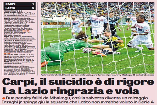Gazzetta dello Sport: “Carpi, il suicidio è di rigore. La Lazio ringrazia e vola. Due penalty falliti da Mbakogu, così la salvezza diventa un miraggio…”