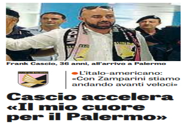 “L’ irruzione di Frank Cascio per l’acquisizione del Palermo ha scaldato la piazza. Un volto e un nome lo rendono più tangibile della cordata cinese che resta ancora nell’ombra. Le sue origini palermitane fanno il resto. L’imprenditore americano, in 48 ore, si è mosso alla velocità della luce. Ha incontrato due volte Zamparini e poi si è catapultato nel capoluogo siciliano. Al suo arrivo una cinquantina di tifosi l’ha accolto all’aeroporto con cori. «Zamparini e la sua famiglia sono delle persone speciali – ha detto Cascio –. Siamo d’accordo e stiamo andando avanti in un processo. Si va avanti veloce, Zamparini sa dov’è il mio cuore, per me e lui è importante il futuro del Palermo. Vuole conoscere il mio gruppo e il progetto, penso che siamo d’accordo. Non parliamo di soldi». Poi si è diretto verso Castelbuono da dove suo padre ha mosso i passi come direttore di un albergo di Taormina, prima di spostarsi negli States in un hotel di lusso. Lì Cascio costruisce il suo business grazie all’amicizia con Michael Jackson di cui diventa assistente e producer e attraverso investimenti nel settore immobiliare, nella ristorazione e nell’energia rinnovabile. Ora spera di convincere Zamparini a vendergli il Palermo“. Questo quanto scrive l’edizione odierna de “La Gazzetta dello Sport”.