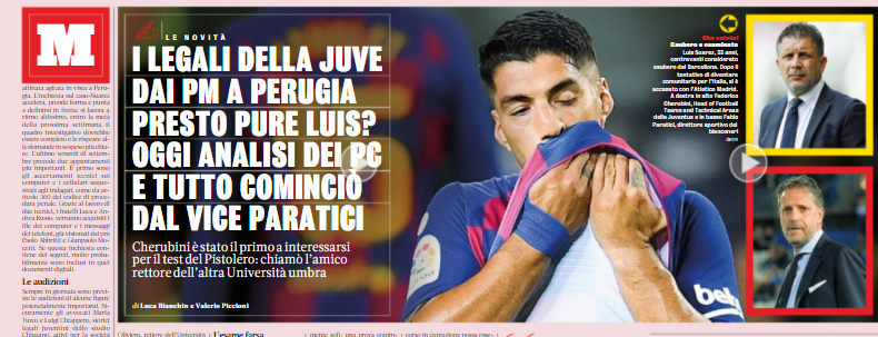 L’ultimo venerdì di settembre prevede due appuntamenti più importanti. Il primo sono gli accertamenti tecnici sui computer e i cellulari sequestrati agli indagati, come da articolo 360 del codice di procedura penale. Grazie al lavoro di due tecnici, i fratelli Luca e Andrea Russo, verranno acquisiti i file dei computer e i messaggi dei telefoni, già visionati dai pm Paolo Abbritti e Gianpaolo Mocetti. Sempre in giornata sono previste le audizioni di alcune figure potenzialmente importanti. Sicuramente gli avvocati Maria Turco e Luigi Chiappero, storici legali juventini dello studio Chiusano, attivi per la società anche nei contatti con l’Università per Stranieri di Perugia. A Perugia si comincia a parlare anche dell’audizione di Luis Suarez, che potrebbe essere sentito nei prossimi giorni. La notizia che ha fatto più rumore a Perugia però ieri è stata l’identificazione dell’uomo-Juve che ha contattato Maurizio Oliviero, rettore dell’Università di Perugia: si tratta di Federico Cherubini, umbro, braccio destro di Fabio Paratici.