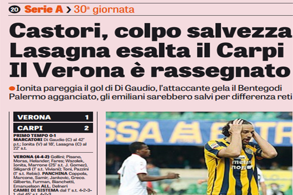 Gazzetta dello Sport: “Castori, colpo salvezza. Lasagna esalta il Carpi. Il Verona è rassegnato. Ionita pareggia il gol di Di Gaudio, l’attaccante gela il Bentegodi. Palermo agganciato”