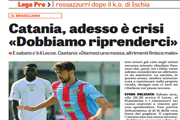 Gazzetta dello Sport: “Catania, adesso è crisi: «Dobbiamo riprenderci». E sabato c’è il Lecce. Caetano: «Diamoci una mossa, altrimenti finisce male»”