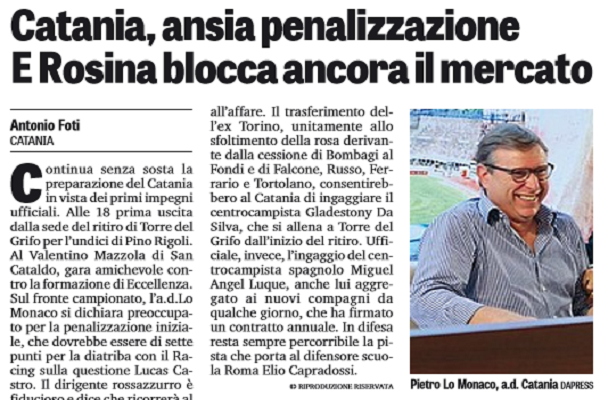 “Continua senza sosta la preparazione del Catania in vista dei primi impegni ufficiali. Alle 18 prima uscita dalla sede del ritiro di Torre del Grifo per l’undici di Pino Rigoli. Al Valentino Mazzola di San Cataldo, gara amichevole contro la formazione di Eccellenza. Sul fronte campionato, l’a.d.Lo Monaco si dichiara preoccupato per la penalizzazione iniziale, che dovrebbe essere di sette punti per la diatriba con il Racing sulla questione Lucas Castro. Il dirigente rossazzurro è fiducioso e dice che ricorrerà al tribunale della Fifa e successivamente al Tas, ma non crede che per l’inizio del torneo di Lega Pro si possa arrivare a uno sconto. Maggiore motivazione per il Catania? Lo scorso campionato, in effetti, fu così, anche se il vantaggio per le altre formazioni non è indifferente. «Prima di presentare ricorso bisogna aspettare che la sanzione, già comminata dalla Fifa, ci venga notificata». LUQUE Per quel che riguarda il mercato, tra i problemi che il Catania dovrà risolvere nelle prossime ore c’è il caso Rosina. Il giocatore dall’inizio del ritiro si allena a Torre del Grifo. Non v’è dubbio che il matrimonio tra la società e l’attaccante sia ormai più che logoro. Lo Monaco sta aspettando notizie dalla Salernitana per la cessione, in ogni caso pare che con una buonuscita di 250 mila euro una soluzione si potrebbe trovare imprimendo una accelerazione all’affare. Il trasferimento dell’ex Torino, unitamente allo sfoltimento della rosa derivante dalla cessione di Bombagi al Fondi e di Falcone, Russo, Ferrario e Tortolano, consentirebbero al Catania di ingaggiare il centrocampista Gladestony Da Silva, che si allena a Torre del Grifo dall’inizio del ritiro. Ufficiale, invece, l’ingaggio del centrocampista spagnolo Miguel Angel Luque, anche lui aggregato ai nuovi compagni da qualche giorno, che ha firmato un contratto annuale. In difesa resta sempre percorribile la pista che porta al difensore scuola Roma Elio Capradossi”. Questo quanto riportato dall’edizione odierna de “La Gazzetta dello Sport”.