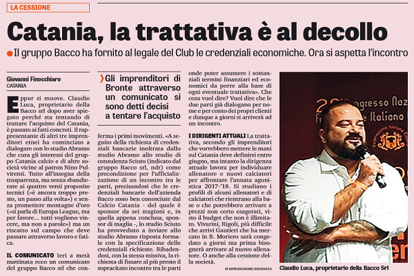 “Eppur si muove. Claudio Luca, proprietario della Bacco srl dopo aver spiegato perché sta tentando di trattare l’acquisto del Catania, è passato ai fatti concreti. Il rappresentante di altri tre imprenditori etnei ha cominciato a dialogare con lo studio Abramo che cura gli interessi del gruppo Catania calcio e di altre società vicine al patron Nino Pulvirenti. Tutto all’insegna della trasparenza, ma senza sbandierare ai quattro venti proposito tecnici («è ancora troppo presto, un passo alla volta») e senza promettere montagne d’oro («si parla di Europa League, ma per favore… tutti vogliono vincere, ma non a parole») ma un riscatto sul campo che deve passare attraverso lavoro e fatica. IL COMUNICATO Ieri a metà mattinata ecco un comunicato del gruppo Bacco srl che con ferma i primi movimenti. «A seguito della richiesta di credenziali bancarie inoltrata dallo studio Abramo allo studio di consulenza Sciuto (indicato dal gruppo Bacco srl, ndr) come precondizione per l’ufficializzazione di un incontro tra le parti, precisandosi che le credenziali bancarie dell’azienda Bacco sono ben conosciute dal Calcio Catania del quale è sponsor da sei stagioni e, in quella appena conclusa, sponsor di maglia , lo studio Sciuto ha provveduto a inviare allo studio Abramo risposta formale con la specificazione delle credenziali richieste. Ribadendosi, con la stessa missiva, la richiesta di fissare al più presto il sopracitato incontro tra le parti onde poter assumere i sostanziali termini finanziari ed economici da porre alla base di ogni eventuale trattativa». Che cosa vuol dire? Vuol dire che le due parti già dialogano per nome e per conto dei propri clienti e dunque a giorni si arriverà ad un incontro. I DIRIGENTI ATTUALI La trattativa, secondo gli imprenditori che vorrebbero mettere le mani sul Catania deve definirsi entro giugno, ma intanto la dirigenza attuale lavora per individuare allenatore e nuovi calciatori per affrontare l’annata agonistica 2017’18. Si studiano i profili di alcuni allenatori e di calciatori che rientrano alla base o che potrebbero arrivare a prezzi non certo esagerati, visto il budget che non è illimitato. Vivarini, Rigoli, più difficile che arrivi Gautieri che ha mercato in B. Moriero sarà congedato a giorni ma prima bisognerà arrivare al nuovo allenatore. O anche alla cessione della società”. Questo quanto si legge sull’edizione odierna de “La Gazzetta dello Sport”.