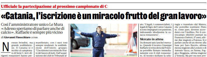L’edizione odierna della “Gazzetta dello Sport” si sofferma sull’iscrizione del Catania. L’amministratore unico Nico Le Mura ha manifestato la sua felicità: «L’iscrizione è un miracolo frutto del lavoro di tutti. Dall’acquisizione del club in Tribunale all’iscrizione abbiamo corso come matti lavorando 24 ore su 24 per battere il tempo. Adesso speriamo di parlare anche di calcio perché dopo l’iscrizione dobbiamo risanare la società e sarà un percorso altrettanto difficoltoso».
