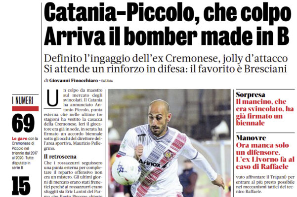 L’edizione odierna della “Gazzetta dello Sport” si sofferma sul Catania. Colpo da maestro sul mercato degli svincolati: il club rossazzurro ha annunciato Antonio Piccolo, punta esterna che nelle ultime tre stagioni ha vestito la casacca della Cremonese.
