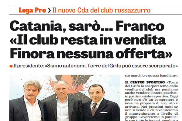 Gazzetta dello Sport: “Catania, sarò…Franco: «Il club resta in vendita. Finora nessuna offerta» Il presidente: «Siamo autonomi, Torre del Grifo può essere scorporato»”