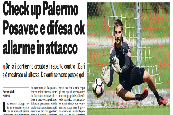 Gazzetta dello Sport: “Check up Palermo: Posavec e difesa ok, allarme in attacco. Brilla il portierino croato e il reparto contro il Bari s’è mostrato all’altezza. Davanti servono peso e gol”