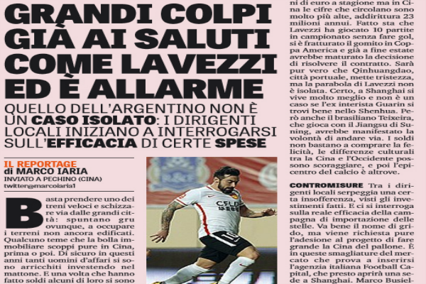 “Basta prendere uno dei treni veloci e schizzare via dalle grandi città: spuntano gru ovunque, a occupare i terreni non ancora edificati. Qualcuno teme che la bolla immobiliare scoppi pure in Cina, prima o poi. Di sicuro in questi anni tanti uomini d’affari si sono arricchiti investendo nel mattone. E una volta che hanno fatto soldi alcuni di loro si sono comprati squadre di calcio: da Shanghai a Hangzhou, da Tianjin a Guangzhou. Capitani dell’edilizia e non solo. I paperoni del pallone stanno rendendo la Chinese Super League sempre più competitiva, come dimostrano gli oltre 250 milioni di euro spesi in trasferimenti lo scorso inverno nell’ultima sessione di mercato, senza contare le folli cifre per gli stipendi. In Cina sono sbarcati volti noti in quantità: basti pensare ai «nostri» Pellè, Lavezzi, Gervinho, Guarin. Più presenze negli stadi, moltiplicazione dei diritti tv. Ma c’è anche l’altra faccia della medaglia. ALLARME Alcuni club cominciano a lamentarsi, e forse a rimpiangere certi acquisti. Il fatto è che le vagonate di renminbi allettano le stelle internazionali ma se non ci si ambienta, se mancano le motivazioni può capitare di recitare da comparse in campo o, peggio, di decidere di andare via anzitempo. Tra chi è arrivato all’inizio dell’anno c’è già qualcuno che sta meditando la fuga anticipata. È il caso di Ezequiel Lavezzi, che a metà febbraio si è trasferito dal Psg all’Hebei con un biennale: in Europa si è parlato di un ingaggio da 15 milioni di euro a stagione ma in Cina le cifre che circolano sono molto più alte, addirittura 23 milioni annui. Fatto sta che Lavezzi ha giocato 10 partite in campionato senza fare gol, si è fratturato il gomito in Coppa America e già a fine estate avrebbe maturato la decisione di risolvere il contratto. Sarà pur vero che Qinhuangdao, città portuale, mette tristezza, ma la parabola di Lavezzi non è isolata. Certo, a Shanghai si vive molto meglio e non è un caso se l’ex interista Guarin si trovi bene nello Shenhua. Però anche il brasiliano Teixeira, che gioca con il Jiangsu di Suning, avrebbe manifestato la volontà di andare via. I soldi non bastano a comprare la felicità, le differenze culturali tra la Cina e l’Occidente possono scoraggiare, e poi l’epicentro del calcio è altrove. CONTROMISURE Tra i dirigenti locali serpeggia una certa insofferenza, visti gli investimenti fatti. E ci si interroga sulla reale efficacia della campagna di importazione delle stelle. Va bene il nome di grido, ma viene richiesta pure l’adesione al progetto di fare grande la Cina del pallone. È in queste smagliature del mercato che prova a inserirsi l’agenzia italiana Football Capital, che presto aprirà una sede a Shanghai. Marco Busiello, China country manager, sta girando il Paese in lungo e in largo: «I club cinesi vogliono strutture che li tutelino, sono un po’ stanchi degli agenti che vengono a fare le operazioni e poi salutano. Noi cerchiamo di offrire un supporto in loco e di indirizzarli nella scelta degli stranieri che abbiano le giuste motivazioni e capacità di adattamento. È sbalorditiva la velocità con cui è stato applicato il messaggio del governo, però a fronte di tanti investimenti ci si chiede cosa succederà a queste squadre fra qualche anno. Avranno fatto il salto di qualità in termini manageriali? Si saranno dotate di adeguati settori giovanili?». È questa la vera sfida del Dragone.”. Questo quanto riportato da “La Gazzetta dello Sport”.