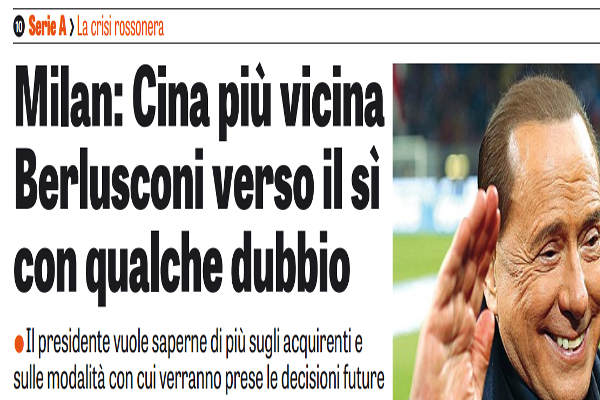 Gazzetta dello Sport: “Milan: Cina più vicina, Berlusconi verso il sì con qualche dubbio…”