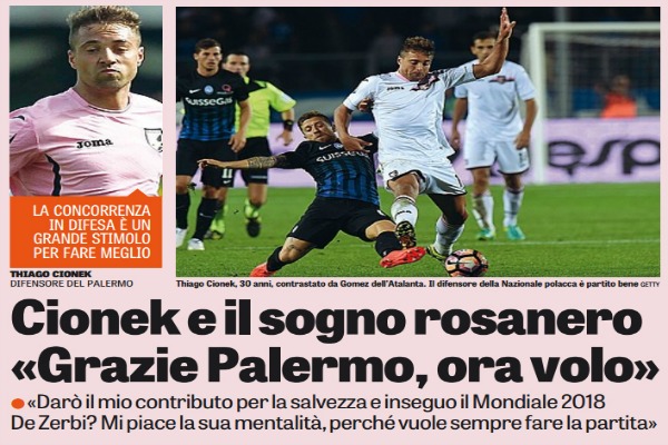 PASSIONE E IDEE Da De Zerbi, le differenze ci sono e hanno coinvolto il gruppo. «Ballardini ha fatto un grande lavoro con noi, dovevamo giocare per salvarci con lui e ci siamo riusciti – precisa Cionek –. De Zerbi ha caratteristiche diverse, ha il suo modo di giocare, sta provando anche a cambiare la mentalità e noi abbiamo voglia per imparare. Se devo scegliere una cosa c’è che vuole fare sempre lui la partita. E’ un appassionato, ha smesso di giocare da poco e conosce bene la mentalità dei giocatori, penso possa darci una grossa mano». In difesa c’è molta concorrenza, sei difensori centrali sono tanti, ma Cionek non è preoccupato. «È vero, tanti rimangono fuori, è dura perché a me non piace stare fuori, anche se rispetto la decisione del tecnico. Cerco di convincerlo a ogni allenamento, però è bello che ci siano tanti giocatori importanti. Difesa a tre o a quattro? Con l’Atalanta ho fatto il terzino e il centrale, nel calcio serve elasticità. A noi difensori De Zerbi chiede che si esca palla al piede, per creare la superiorità numerica. Su questo, dobbiamo ancora migliorare». Finora il Palermo ha raccolto punti solo in trasferta. Domenica c’è la sfida a Marassi con la Sampdoria reduce da quattro sconfitte consecutive. «Fuori casa contro la Samp è una partita tosta, è una squadra che ha grande qualità davanti, per i difensori non sarà facile. Però vogliamo continuare a crescere»”. Questo ciò che si legge sull’edizione odierna de “La Gazzetta dello Sport”.