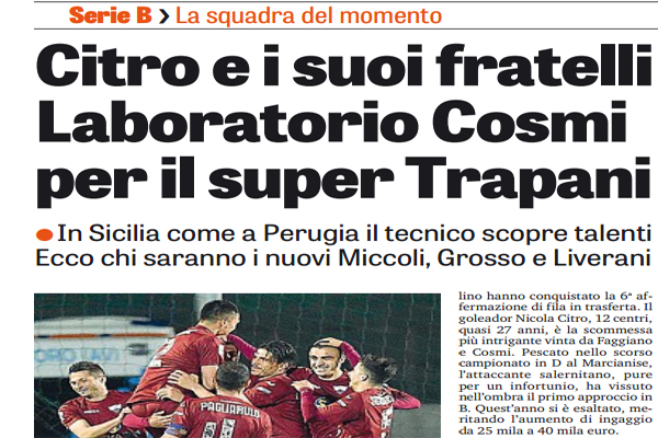 Gazzetta dello Sport: “Citro e i suoi fratelli. Laboratorio Cosmi per il super Trapani. In Sicilia il tecnico scopre talenti, ecco chi saranno i nuovi Miccoli, Grosso e Liverani”