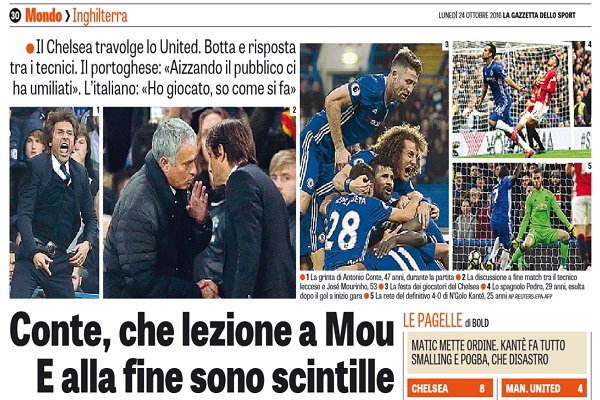 Gazzetta dello Sport: “Conte, che lezione a Mou. E alla fine sono scintille”