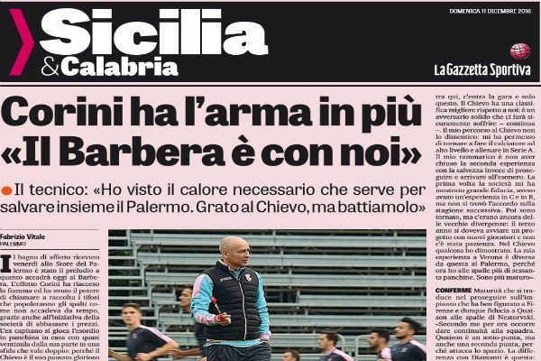 Gazzetta dello Sport: “Corini ha l’arma in più: «Il Barbera è con noi. Grato al Chievo, ma battiamolo»”