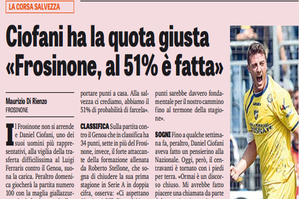 “Il Frosinone non si arrende e Daniel Ciofani, uno dei suoi uomini più rappresentativi, alla vigilia della trasferta difficilissima al Luigi Ferraris contro il Genoa, suona la carica. Peraltro domenica giocherà la partita numero 100 con la maglia giallazzurra. «Sarà fondamentale l’atteggiamento che avremo dice subito lui , che dovrà essere quello da ultima spiaggia o se volete da playoff visto che negli anni passati in questi casi non abbiamo mai sbagliato spiega il bomber, 8 gol con 2 rigori come bottino personale . Siamo nel momento topico del campionato e non possiamo sbagliare. Sarà importante portare punti a casa. Alla salvezza ci crediamo, abbiamo il 51% di probabilità di farcela». CLASSIFICA Sulla partita contro il Genoa che in classifica ha 34 punti, sette in più del Frosinone, invece, il forte attaccante della formazione allenata da Roberto Stellone, che sogna di chiudere la sua prima stagione in Serie A in doppia cifra, osserva: «Ci aspettano 90 minuti difficili perché i nostri avversari hanno l’opportunità di chiudere virtualmente il discorso salvezza. Perciò non dovremo sbagliare l’approccio e mi auguro che gli episodi ci siano favorevoli come in occasione della trasferta a Empoli. Personalmente spero di vincere la partita, pur senza una bella prestazione. Già perché portare a casa i tre punti sarebbe davvero fondamentale per il nostro cammino fino al termine della stagione». SOGNI Fino a qualche settimana fa, peraltro, Daniel Ciofani aveva fatto un pensierino alla Nazionale. Oggi, però, il centravanti è tornato con i piedi per terra. «Ormai è un discorso chiuso. Mi avrebbe fatto piacere una chiamata da parte del commissario tecnico, ma credo che a questo punto gli esperimenti di Conte siano finiti. E, poi, sinceramente penso che prima di me il mister avrebbe dovuto chiamare un attaccante più esperto come Maccarone, uno che di gol in carriera ne ha segnati sempre a grappoli. Ora penso solo alla salvezza del Frosinone»”. Questo quanto si legge sull’odierna edizione de “La Gazzetta dello Sport” in merito alla corsa salvezza del Frosinone.