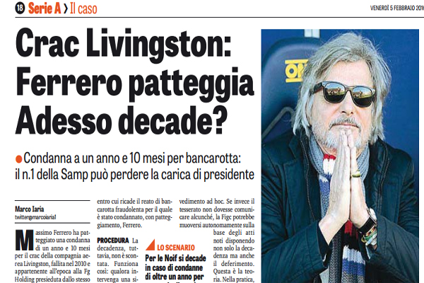 Gazzetta dello Sport, crac Livingston: “Ferrero patteggia un anno e dieci mesi. Adesso decade da presidente della Samp? – I dettagli”