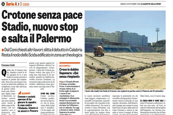 Gazzetta dello Sport: “Crotone senza pace: Stadio, nuovo stop e salta il Palermo. Dal Coni chiesti altri lavori. Slitta il debutto in Calabria. Resta il nodo dello Scida edificato in zona archeologica”