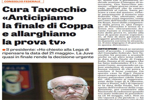 Gazzetta dello Sport, cura Tavecchio: «Anticipiamo la finale di Coppa e allarghiamo la prova tv»