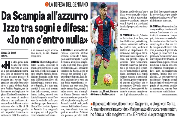 “«Ho letto queste notizie che mi vedono coinvolto in vicende a me assolutamente estranee. Sono un calciatore e non ho mai neanche pensato di truccare una partita. Voglio precisare che nelle due partite di cui si parla, Modena-Avellino e Avellino-Reggina, ero infortunato e non ho giocato. Ho piena fiducia nella magistratura e sono sicuro di riuscire a chiarire la mia posizione». Armando Izzo si difende così da un’accusa che rischia di distruggere una carriera, partita dai campetti di Scampia e da un’infanzia difficile e arrivata a un passo dal sogno azzurro. Una storia, la sua, davvero complicata. INFERNO Il Lotto G fa parte del Terzo Mondo, qualcuno lo chiama semplicemente le Case dei puffi, perché il palazzo è tutto azzurro. Siamo a Secondigliano-Scampia, nella zona nord di Napoli: squallore, edilizia selvaggia, cemento armato e degrado, lì ci sono stati omicidi, lì sono stati arrestati boss della camorra, scoperti dentro bunker, nascosti sotto botole, lì ragazzini armati facevano da sentinelle per lo spaccio di droga e per il commercio di armi. Lì è cresciuto il genoano Armando Izzo, inseguendo un sogno, suo e di papà Vincenzo: diventare calciatore. IL SOGNO Zio Mimmo Micallo conosce qualcuno all’Arci Scampia, Armando è bravo, gioca centrocampista e sogna di emulare un ragazzo spagnolo che si chiama Xavi e gioca nel Barcellona. A 11 anni viene tesserato dal Napoli, dopo un provino che convince il dirigente Peppe Santoro. Papà Enzo lo lascia andare a patto che non debba pagare la retta: soldi in casa non ce ne sono. Due anni e mezzo dopo, quando il padre muore, tutto si complica. Mamma Giovanna resta disoccupata e ci sono quattro fratelli più piccoli da seguire, così Armando lascia il calcio, vuole lavorare: fa il barista e il muratore, viene sfiorato forse pure qualche tentazione. Poi trova una persona speciale: Paolo Palermo, quello che tutt’ora è il suo procuratore, che lo incoraggia, lo aiuta economicamente e lo convince a ritentare con il Napoli e a trascinarsi fuori dal gorgo che lo sta risucchiando. IL PERICOLO Suo zio, Salvatore Petriccione, è un boss, suo fratello Gennaro, detto Genny, scivola lentamente nell’incubo: qualche furto, poi forse il traffico di stupefacenti. Armando nel frattempo è diventato un difensore, tecnico e veloce, ma piccolo. Sogna di emulare Fabio Cannavaro, Mazzarri lo convoca per un ritiro e gli compra pure le scarpe, per permettergli di allenarsi con i compagni, ma il Napoli ci crede poco: va in prestito alla Triestina, poi in comproprietà gratuita all’Avellino, che lo riscatterà per 200 mila euro e lo cederà al Genoa per 400. Armando, neppure maggiorenne, è già diventato padre, sta con Titti, il suo grande amore, ha dovuto lottare per averlo, ma la nascita di Aurora e Vittoria lo faranno maturare. LA DIFESA A Genova si esalta, conquista Gasp, che riesce a limitarne l’esuberanza e la teatralità, fa innamorare i compagni, che trovano un sorriso furbo e un inventore di scherzi. In campo regala ai tifosi una perla, rara per un difensore: l’elastico, una di quelle giocate che a Napoli gli erano valse il soprannome “o’ brasiliano”. Convince il presidente Preziosi, di cui diventa un pupillo e che ora non riesce a credere alle accuse: «Armando è un ragazzo solare – dice – un giocatore importante, l’anima dello spogliatoio. Lo proteggeremo in tutti i modi». Per prima cosa gli hanno fornito buoni avvocati, perché c’è un accusa terribile da contrastare, come se fosse un attaccante temibilissimo”. Questo quanto si legge sull’edizione odierna de “La Gazzetta dello Sport”.