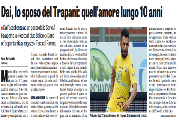 STAKANOVISTA Da sempre il suo ruolo è quello di solcare la fascia sinistra, partendo dalla retrovie. Certo, avere davanti a sé uno stakanovista come Simone Rizzato non lo aiuta a trovare presenze e minuti. Nino Daì, però, è diventato uomo, e i suoi pensieri sono rivolti anche ad altro. Insieme ad un gruppo di amici, ha ideato una scuola calcio, la «Football Club Belice», che ha sede a Partanna e desidera dare un’opportunità a tutti i ragazzi di una zona difficile come quella della Valle del Belice. «Sono originario di Gibellina, ma Partanna è il paese di mia moglie e ormai lo sento mio. Avendo un campo in cui giocare, qualcuno di questi ragazzi può arrivare in serie B: mi piacerebbe condividere con qualcuno di loro la fortuna che io ho avuto». Poi, torna sul Trapani che sta nascendo. C’è da metabolizzare la stagione appena conclusa: esaltante, ma struggente nel finale. «Meritavamo la serie A – sottolinea – ma non è andata come speravamo. Riproveremo a fare del nostro meglio. Sono arrivati tanti nuovi compagni, bravi a giocare a calcio e con ottime qualità morali. Ormai sono esperto e non mi sbilancio: ma questo può essere un altro bel Trapani». Dopo la ripresa del lavoro di ieri, i granata questo pomeriggio (Pinzolo, ore 17.30) tornerà in campo contro il Parma. Un altro test utile a Serse Cosmi per capire lo stato di forma della squadra, ad una settimana dall’esordio in Tim Cup“. Questo quanto si legge nell’edizione odierna de “La Gazzetta dello Sport”.