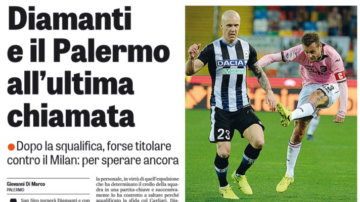 Gazzetta dello Sport: “Diamanti e il Palermo all’ultima chiamata. Dopo la squalifica, forse titolare contro il Milan: per sperare ancora”