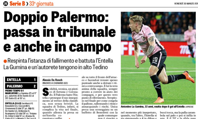 L’edizione odierna de “La Gazzetta dello Sport” ha analizzato la sfida vinta ieri dal Palermo contro l’Entella: “Solidità, tecnica, un pizzico di fortuna e Coronado. Il Palermo batte l’Entella e prosegue il suo inseguimento al vertice della classifica, non senza brividi. La squadra di Tedino, infatti, si complica la vita nel finale, quando allenta la presa su un’Entella coraggiosa e soffre nel finale confuso. La giornata dei siciliani, però, è speciale, completata com’è dal successo colto anche in tribunale, visto che l’istanza per il fallimento della società è stata respinta. PROTAGONISTA Chi indirizza le sorti della sfida è il brasiliano Coronado, schierato da Tedino (che si presenta allo stadio in auto e non con il pullman della squadra a causa di un’influenza per non rischiare di contagiare i giocatori) come seconda punta, a completare il reparto con La Gumina, abile a non dare punti di riferimento ai liguri, partendo da destra ma cercando poi lo spazio ideale su tutto il fronte dell’attacco e facendosi trovare spesso puntuale anche a dettare i ritmi a centrocampo. È lui la vera anima della squadra, sempre pronto a correre in aiuto dei compagni, e per questo vero punto di riferimento. Strepitoso nel finale per come congela il pallone, rallentando i ritmi e annacquando i rischi. Unica pecca una sceneggiata su un buffetto di Benedetti con la quale comunque non è riuscito a ingannare l’arbitro. SPRINT Il Palermo sblocca la sfida in fretta, al 17’, con Coronado in percussione, Crimi che pare bloccarlo ma poi cade, la palla filtra verso La Gumina, abilissimo a eludere la guardia di Cremonesi e a battere Iacobucci. Struna e Rajkovic schiantano fisicamente La Mantia, mentre Jajalo fa diga davanti a loro. Il Palermo così sembra in controllo con facilità. Solo De Luca, poco prima dell’intervallo, si rende pericoloso con un destro di poco alto. Più passa il tempo, però, più la squadra di Tedino pare accontentarsi. Il raddoppio arriva nel momento più inaspettato, quando, tra l’altro, l’Entella si sta sistemando a 4 in difesa e forse proprio per quello è mal posizionata: rinvio lungo, rimpallo che sembra liberare Gnahorè e tocco disperato di De Santis, che indirizza il pallone nella propria porta. Iacobucci tocca, ma la palla carambola sul palo e poi si infila in rete. È il 29’ e la sfida pare chiusa. Non è così. REAZIONE L’Entella ha il merito di non arrendersi mai. Aglietti quello di trovare le mosse giuste per complicare la vita a Tedino: prima passa al 3-4-1-2, inserendo Aramu alle spalle di La Mantia e De Luca. Poi rischiando il tutto per tutto con Troiano al posto di un A campora ormai stanco e poco lucido, e passando al 4-2-4. Gatto, al 35’ trova, con un po’ di fortuna e una deviazione, il gol della speranza. Poi Aramu ci prova in tutti i modi, andando vicino al gol in due occasioni. Nel recupero pure Ceccarelli si trasforma in centravanti aggiunto, inutilmente, ma l’Entella, pur sconfitta, si può godere la buona notizia del rientro, positivo, di Troiano, suo elemento fondamentale”.
