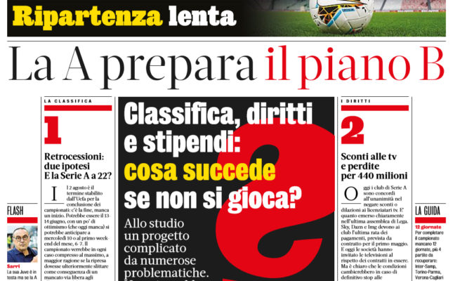 Gazzetta dello Sport: “Due retrocessioni o Serie A da 22, sconto alle pay tv e tagli ai calciatori. Il piano B del calcio”