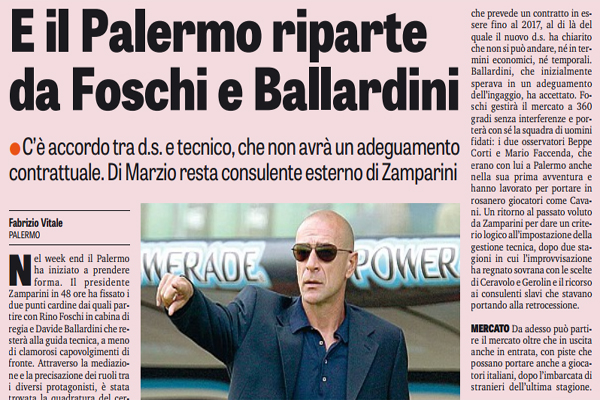 Gazzetta dello Sport: “E il Palermo riparte da Foschi e Ballardini. C’è accordo tra d.s. e tecnico, che non avrà un adeguamento contrattuale. Oggi il Patron in città”