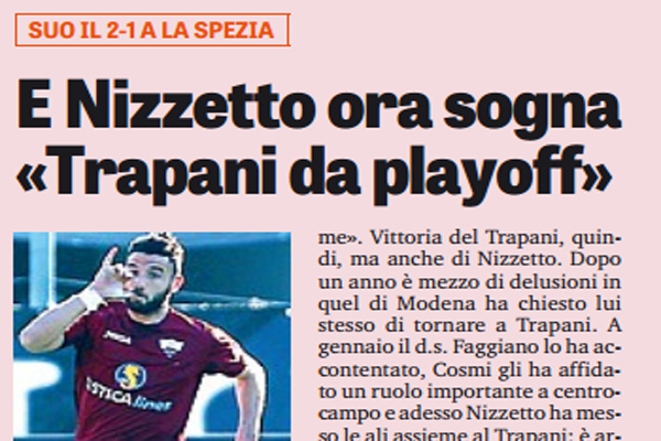 “«Sognare non costa nulla: siamo arrivati a 50 punti, stiamo giocando bene, siamo convinti della nostra forza e abbiamo voglia di fare qualcosa di bello. Io per primo, a 30 anni, se non sogno adesso non sogno più. A questo punto, pertanto, vogliamo sognare»: la riflessione è di Luca Nizzetto, l’autore del golvittoria a La Spezia. Sue anche le lacrime a fine partita. Lacrime di gioia, s fo g o d i una rabbia repressa, a lungo cont e n u t a : «Sono felice – confess a – . H o passato un periodo un po’ brutto, ho ingoiato tanti bocconi amari. Era da tanto tempo che sognavo di segnare un gol così importante. Sono contento per la squadra perché con questo successo abbiamo raggiunto la fatidica quota salvezza, ma per una volta voglio essere un po’ egoista, sono contento per me». Vittoria del Trapani, quindi, ma anche di Nizzetto. Dopo un anno è mezzo di delusioni in quel di Modena ha chiesto lui stesso di tornare a Trapani. A gennaio il d.s. Faggiano lo ha accontentato, Cosmi gli ha affidato un ruolo importante a centrocampo e adesso Nizzetto ha messo le ali assieme al Trapani: è arrivata a sette la striscia positiva dei granata (5 vittorie e 2 pareggi, 12 gol fatti e 6 subiti) e uno straordinario bilancio di 5 vittorie nelle ultime 6 trasferte. ANTICIPO Col successo di La Spezia oltre a guadagnarsi con largo anticipo l’ammissione alla «IV B», ovvero la quarta stagione in B, il Trapani si ritrova sulla soglia della zona playoff. Non vi è dentro solo perché le altre due squadre a 50 punti, Entella e Brescia, lo precedono nella classifica avulsa. È anche vero che nel giro di tre punti ci sono sette squadre e che il Trapani si ritrova a 3 dal 3° posto. Con nove partite da giocare, tutto può succedere. Il rischio è che la squadra, una volta centrata la salvezza, molli: «No – dice Nizzetto –! Se dovevamo sgonfiarci sarebbe successo dopo la vittoria sul Livorno. Invece siamo andati a La Spezia ad affrontare la squadra più in forma e dopo 5’ siamo andati sotto. Se eravamo sgonfi ne avremmo presi 4. E invece abbiamo reagito e sapete com’è finita». Sabato arriverà il Brescia dell’ex Boscaglia: «L’avversario conta poco. Abbiamo fatto delle partitone contro tutti. Dipende solo da noi»”. Questo quanto si legge sull’edizione odierna de “La Gazzetta dello Sport”.