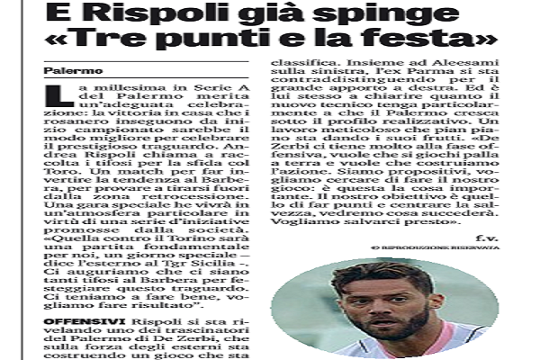 “La millesima in Serie A del Palermo merita un’adeguata celebrazione: la vittoria in casa che i rosanero inseguono da inizio campionato sarebbe il modo migliore per celebrare il prestigioso traguardo. Andrea Rispoli chiama a raccolta i tifosi per la sfida col Toro. Un match per far invertire la tendenza al Barbera, per provare a tirarsi fuori dalla zona retrocessione. Una gara speciale he vivrà in un’atmosfera particolare in virtù di una serie d’iniziative promosse dalla società. «Quella contro il Torino sarà una partita fondamentale per noi, un giorno speciale – dice l’esterno al Tgr Sicilia . Ci auguriamo che ci siano tanti tifosi al Barbera per festeggiare questo traguardo. Ci teniamo a fare bene, vogliamo fare risultato”. OFFENSIVI Rispoli si sta rivelando uno dei trascinatori del Palermo di De Zerbi, che sulla forza degli esterni sta costruendo un gioco che sta cominciando a muovere la classifica. Insieme ad Aleesami sulla sinistra, l’ex Parma si sta contraddistinguendo per il grande apporto a destra. Ed è lui stesso a chiarire quanto il nuovo tecnico tenga particolarmente a che il Palermo cresca sotto il profilo realizzativo. Un lavoro meticoloso che pian piano sta dando i suoi frutti. «De Zerbi ci tiene molto alla fase offensiva, vuole che si giochi palla a terra e vuole che costruiamo l’azione. Siamo propositivi, vogliamo cercare di fare il nostro gioco: è questa la cosa importante. Il nostro obiettivo è quello di far punti e centrare la salvezza, vedremo cosa succederà. Vogliamo salvarci presto»”. Questo quanto si legge sull’edizione odierna de “La Gazzetta dello Sport”.