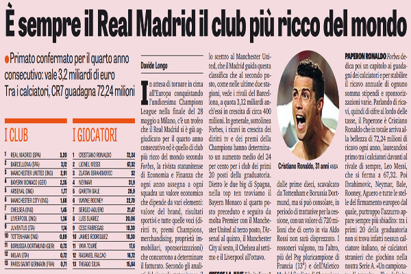 Gazzetta dello Sport: “È sempre il Real Madrid il club più ricco del mondo. Primato confermato per il quarto anno consecutivo: vale 3,2 miliardi di euro. Tra i calciatori, CR7 guadagna 72,24 milioni”