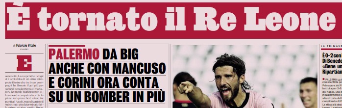 Gazzetta dello Sport: “È tornato il re leone: Palermo da big anche con Mancuso e Corini ora conta su un bomber in più”
