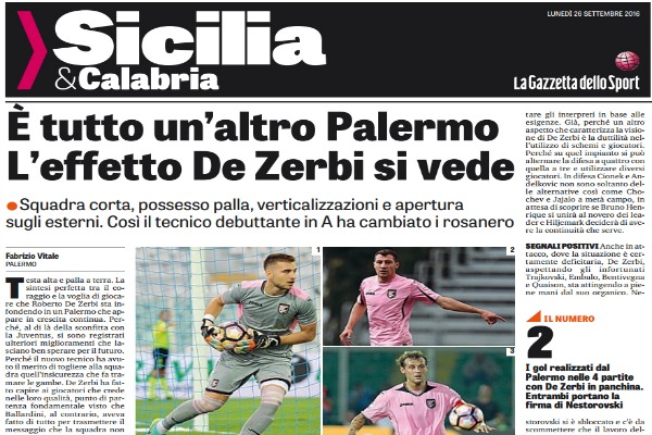 “Testa alta e palla a terra. La sintesi perfetta tra il coraggio e la voglia di giocare che Roberto De Zerbi sta infondendo in un Palermo che appare in crescita continua. Perché, al di là della sconfitta con la Juventus, si sono registrati ulteriori miglioramenti che lasciano ben sperare per il futuro. Perché il nuovo tecnico ha avuto il merito di togliere alla squadra quell’insicurezza che fa tramare le gambe. De Zerbi ha fatto capire ai giocatori che crede nelle loro qualità, punto di partenza fondamentale visto che Ballardini, al contrario, aveva fatto di tutto per trasmettere il messaggio che la squadra non gli andava molto a genio, tanto da arrivare alla rottura con Zamparini. Questo non cancella, comunque, un mercato di basso profilo. L’ex tecnico del Foggia, però, alla sua prima esperienza in A, è animato da una gran voglia di fare e intende produrre qualcosa di importante con quello che ha a disposizione. E dopo quattro partite della sua gestione gli effetti sono già palpabili: squadra corta, possesso palla, verticalizzazioni e apertura sugli esterni. I PUNTI CARDINE De Zerbi sta costruendo un impianto che, tranne con la gara col Napoli, subisce poco. Finora il suo Palermo ha incassato 5 gol, dei quali 3 contro gli azzurri. Per il resto la difesa si sta confermando un reparto affidabile, nel quale Posavec si sta ritagliando un ruolo importante e Gonzalez sta ritornando leader. Il nuovo percorso sta portando anche all’individuazione dei nuovi uomini trascinatori: Rispoli e Aleesami sugli esterni, Gazzi in mezzo al campo e Diamanti in avanti sono i punti cardine di un impianto attorno al quale adattare gli interpreti in base alle esigenze. Già, perché un altro aspetto che caratterizza la visione di De Zerbi è la duttilità nell’utilizzo di schemi e giocatori. Perché su quel impianto si può alternare la difesa a quattro con quella a tre e utilizzare diversi giocatori. In difesa Cionek e Andelkovic non sono soltanto delle alternative così come Chochev e Jajalo a metà campo, in attesa di scoprire se Bruno Henrique si unirà al novero dei leader e Hiljemark deciderà di avere la continuità che serve. SEGNALI POSITIVI Anche in attacco, dove la situazione è certamente deficitaria, De Zerbi, aspettando gli infortunati Trajkovski, Embalo, Bentivegna e Quaison, sta attingendo a piene mani dal suo organico. Nestorovski si è sbloccato e c’è da scommettere che il lavoro dell’allenatore porterà a una crescita tangibile anche di Balogh e Sallai. Dopo la prestazione convincente con la Juve, insomma, c’è la convinzione che questa squadra possa ambire con un pizzico di ottimismo in più alla salvezza. Se anche i tifosi si divertono vuol dire che il lavoro del tecnico è già evidente. Adesso serve solo un po’ di continuità.”. Questo quanto si legge sull’edizione odierna de “La Gazzetta dello Sport”.