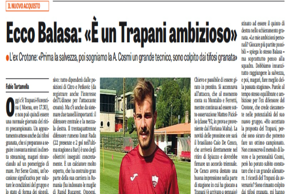 Gazzetta dello Sport: “Ecco Balasa: «È un Trapani ambizioso». L’ex Crotone: «Prima la salvezza, poi sogniamo la A»”