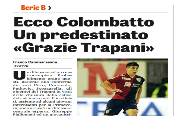 “Un difensore ed un centrocampista. Probabilmente erano questi, assieme alla conferma dei vari Citro, Coronado, Petkovic, Scozzarella, gli obiettivi del Trapani in vista della chiusura della estiva del calciomercato. E in effetti, assieme ad alcuni giovani interessanti per la Primavera, sono arrivati un difensore centrale esperto, Giuseppe Figliomeni ed un giovanissimo centrocampista che però conosce già bene la serie B: Santiago Colombatto, argentino di Cordoba, classe ’97, lo scorso anno col Cagliari 5 gare di campionato e 2 di Tim Cup. Pasquale Sensibile, il d.s. granata, è riuscito a chiudere l’operazione proprio sul filo di lana per via della situazione oltremodo complicata del Pisa cui il Cagliari, proprietaria del cartellino, lo aveva girato in prestito durante l’estate. Quando ha potuto mettere la firma sul contratto che lo lega al Trapani, pertanto, per Santiago Colombatto è stata come la liberazione da una sorta di incubo: «Sono contento di avere fatto questa scelta – confessa – e spero di fare un buon campionato. Ho conosciuto il direttore ed il mister, mi hanno accolto molto bene ed ho avuto una bella impressione».