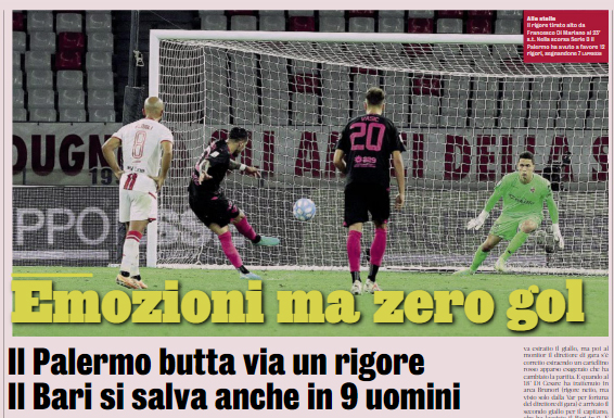 Gazzetta dello Sport: “Emozioni ma zero gol. Il Palermo butta via un rigore. Il Bari si salva anche in 9”