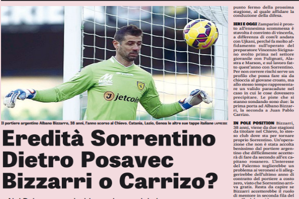 IN POLE POSITION “Bizzarri, 38 anni, viene da due stagioni da titolare nel Chievo, lo stesso club dove sta per tornare proprio Sorrentino. Un’operazione che non è stata accolta benissimo dal portiere argentino che difficilmente accetterà di fare da secondo all’ex capitano rosanero. L’interesse del Palermo toglierebbe un problema ai veronesi e li alleggerirebbe dell’ultimo anno di contratto del portiere a costo zero, visto che Sorrentino arriva gratis. Resta da capire se Bizzarri accetterebbe il ruolo di mentore in seconda fila del pupillo del presidente”.