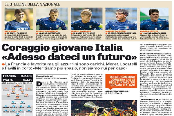 Gazzetta dello Sport: “Europeo Under 19, oggi la finale. Coraggio giovane Italia: «Adesso dateci un futuro»”