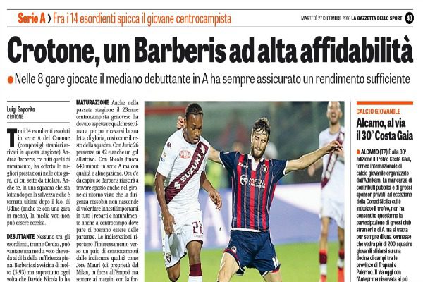 Gazzetta dello Sport: “Ex rosa: Crotone, un Barberis ad alta affidabilità”