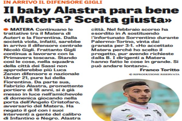 “A Continuano le trattative tra il Matera di Auteri e la Fiorentina. Dalla società viola, infatti, sarebbe in arrivo il difensore centrale Nicolò Gigli. Frattanto Gigli continua a lavorare con la Primavera toscana. Stando così le cose, nella squadra della città dei Sassi non approderebbe più Luca Zanon difensore e nazionale Under 21, pure lui della Fiorentina. Da parte sua, Fabrizio Alastra, promettente portiere di 18 anni, si è già messo in luce nell’amichevole di domenica giocando nella porta dell’Angelo Cristofaro, avversario del Matera. Ha negato il gol con i suoi interventi a gente del calibro di Infantino e Negro. Alastra proviene dalla Primavera del Palermo e ha iniziato a Trapani, la squadra della sua città. Nel febbraio scorso ha esordito in A sostituendo l’infortunato Sorrentino durante Palermo-Torino, vinta dai granata per 3-1. «Ho accettato Matera perché ho scelto il progetto, pur avendo richieste dalla B. I dirigenti a Matera hanno fatto le cose in grande. Si può andare lontano»”. Questo quanto riportato dall’edizione odierna de “La Gazzetta dello Sport”.